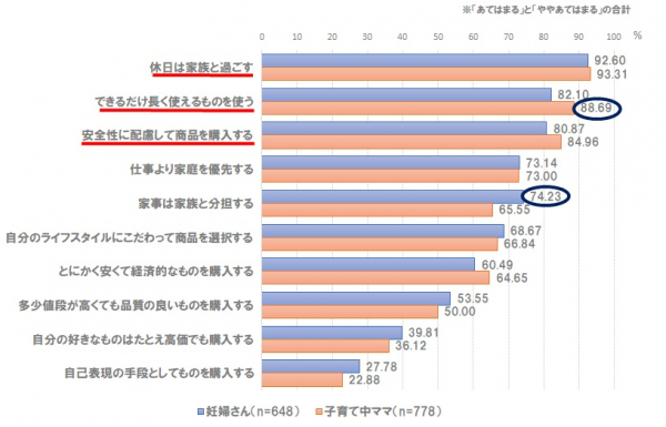 <<妊婦さんも子育て中ママも「休日は家族と過ごし、できるだけ長く使えるものを使い、安全性に配慮して商品を購入する」>>