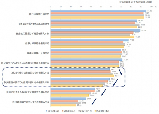 さらに、2018年から2021年における価値観の変化としては、「とにかく安くて経済的なものを購入する」割合が上昇傾向である一方、「多少値段が高くても品質の良いものを購入する」割合は減少傾向であるがわかった。