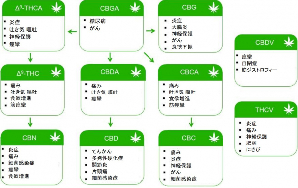 それ以外のCBN,CBC,CBG,CBDA,CBGA,THCA, CBDV,THCVなどは希少カンナビノイドと呼ばれています。