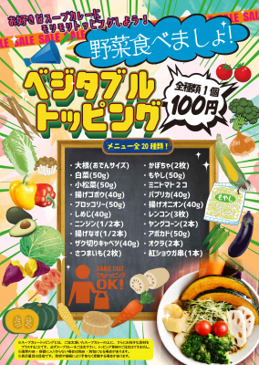 内容:期間中は、全20種類の野菜トッピングをすべて100円(税込)で提供