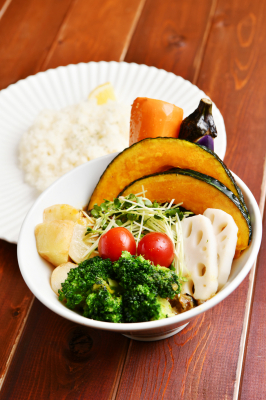 体の芯から温まるスープカレーに、ダイコン(おでんサイズ)、ハクサイ、コマツナ、揚げゴボウ、揚げブロッコリー、ニンジン、揚げナス、ザク切りキャベツなど全20種類のうちお好きなものを選んでトッピングしていただくことで、1日あたり350グラムの野菜の摂取もめざしていただけます。