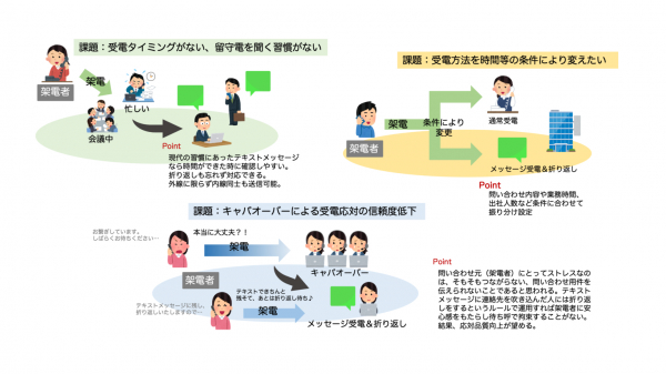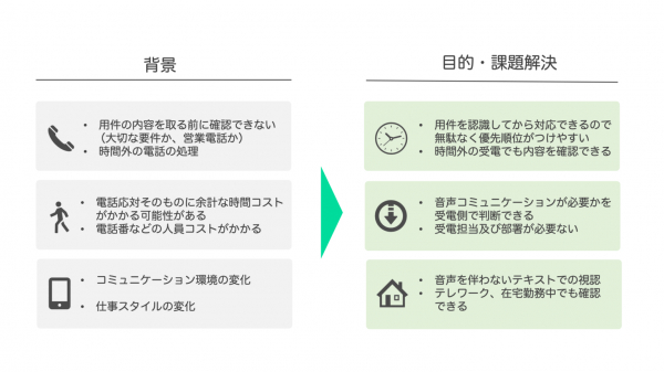 このサービスの大きな特徴は、時間・場所・事情を構わず一方的にかかってくる電話を一旦テキスト化し、メールやチャットで用件を取りこぼすことなく事前に把握することで、受電(電話を受ける)側でコントロールできるようになることです。電話応対による時間・人的コストを削減する一方、用件を事前に把握した上で必要に応じて折り返しの電話をすることより電話応対が可能になるため、受電側のペースで時間を効率的に使うことができます。さらにこの機能を応用することにより、時間外受付を含めた簡易サポート窓口の開設(※2)や、受電代行機能をインハウスで人手を増やさずに実現しBPOコスト削減に貢献するなど、様々なメリットを享受することができます。