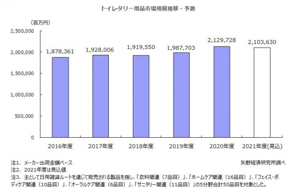 株式会社矢野経済研究所(代表取締役社長:水越孝)は、国内のトイレタリー用品主要50品目の市場を調査し、市場規模や品目別動向、参入企業動向、将来展望を明らかに致しました。