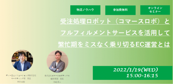 ECやロジスティクスの自動化型DXサービスを提供する株式会社コマースロボティクス(本社:東京都港区、代表取締役:伊藤彰弘、以下当社)は、EC物流サービスを提供するディーエムソリューションズ株式会社(本社:東京都武蔵野市、代表取締役:花矢 卓司、以下 ディーエムソリューションズ)と2022年1月19日(水)に、D2C事業者向け無料WEBセミナー「受注処理ロボット(コマースロボ)とフルフィルメントサービスを活用して繁忙期をミスなく乗り切るEC運営とは」を共催することを本日、お知らせいたします。