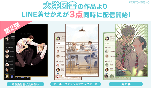 大洋図書×株式会社インクルーズが贈るLINE着せかえシリーズ第2弾は、ヨネダコウ先生「囀る鳥は羽ばたかない」、苑生先生「兎の森」、佐岸左岸先生「オールドファッションカップケーキ」の3作品です!今後も大洋図書とインクルーズのコラボレーションにより、続々と大洋図書作品のLINE着せかえの新作配信を予定しております。是非お気に入りのLINE着せかえを見つけてみてください。