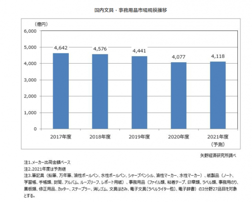2021年度の国内文具・事務用品市場規模は、コロナ禍は継続しているものの、2020年度と比較して学校の休校措置が行われていないことや、経済活動の正常化も進んでいることから、前年度比1.0%増の4,118億円を予測する。