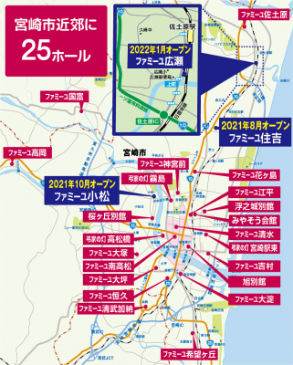 今回オープンするのは、佐土原エリア2号店となる広瀬ホール。宮崎市内近郊では25店舗目を数え、住吉ホール(2021年8月)、小松ホール(2021年10月)に続く、今期3店舗目の直営施設のオープンです。佐土原ホールと住吉ホールとの中間地点にあたり、宮崎市内でも比較的ご高齢の方が多く居住する地域での多店舗展開は、生活者のみなさまのいざというときの選択の幅を広げるだけでなく、移動に負担のかかるご高齢のご遺族・ご親族の参列に配慮し、いつもの暮らしのすぐそばでの心温まるお見送りを実現してまいります。