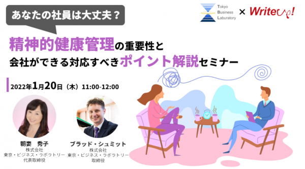 株式会社ライトアップ(本社:東京都渋谷区、代表取締役社長:白石崇、以下ライトアップ)と、株式会社東京・ビジネス・ラボラトリー(本社:東京都中央区、代表取締役:朝妻秀子、以下東京・ビジネス・ラボラトリー)は、社員のメンタルチェックの重要性と対策のポイントを解説するオンラインセミナーを共同で開催いたします。