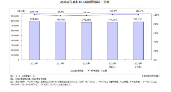 株式会社矢野経済研究所(代表取締役社長:水越孝)は、国内の高機能包装材料市場の動向を調査し、製品セグメント別の動向、参入企業動向、将来展望を明らかにいたしました。