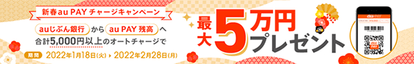 auペイメント株式会社(本社:東京都港区、代表取締役社長:田中 正信)と、auじぶん銀行株式会社(本社:東京都中央区、代表取締役社長:臼井 朋貴、以下 auじぶん銀行)は、2022年1月18日から、「オートチャージで現金が当たる!新春au PAYチャージキャンペーン」(以下 本キャンペーン)を実施します。