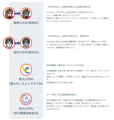 2022年1月現在、17体のAI予想家を展開していますが、親しみやすいよう当社の代表取締役CEOやYouTubeチャンネル出演者の名前等をいくつかのAI予想家に名付けておりました。これらのAI予想家は、競馬予想の思考が似せられるよう学習されたAI予想であり、人間の予想ではありません。よりご理解を深めるためにこの度名称とアイコンを人間離れしたものに変更いたしました。