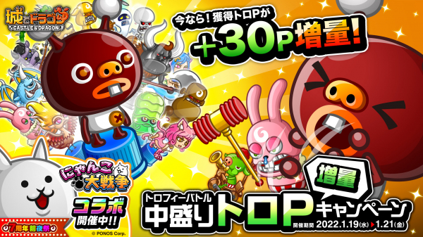 株式会社アソビズム(本社:東京都千代田区、代表取締役:大手智之)は、App Store・Google Playにて好評配信中の『城とドラゴン』で、「トロフィーバトル 中盛りトロP増量キャンペーン」を2021年1月19日(水)より開催いたします。