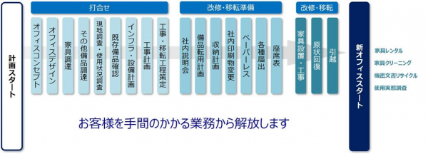 また、新オフィス運営に必要なオフィス用品購買や各種サービスの手配までサポートいたします。