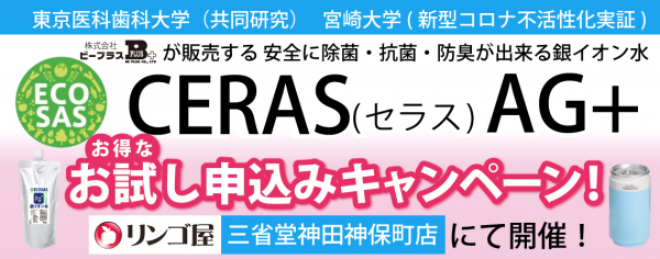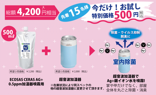 現在、リンゴ屋三省堂神保町店では「ECOSAS CERAS AG+(500ml)0.5ppm噴霧用」と超音波加湿器がセットで500円の「お試し申込みキャンペーン」実施中!