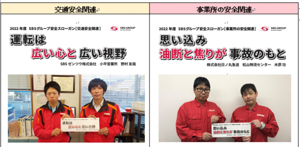 運輸安全推進委員会による審査と従業員の最終投票による選考の結果、「交通安全関連」ではSBSゼンツウ株式会社 野村智也(のむら ともや)の「運転は 広い心と 広い視野」、「事業所の安全関連」では昨年グループ入りした株式会社日ノ丸急送から木原功(きはら こう)の「思い込み 油断の焦りが 事故のもと」が最優秀賞に決定しました。