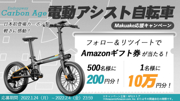 応援購入サービスMakuakeで公開中の電動アシスト自転車「Carbon Age」について、2022年1月24日12:00よりAFUストアのTwitter公式アカウントで、Amazonギフト券10万円分が1名様、200円分が500名様に抽選で当たるMakuake応援キャンペーンを開催しました。