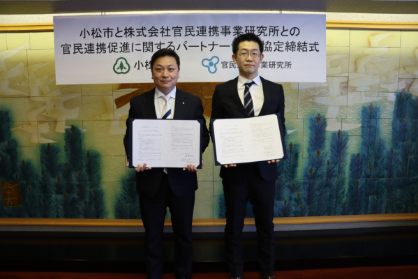 (写真:左から、小松市 宮橋 勝栄 市長、株式会社官民連携事業研究所 代表取締役社長 鷲見 英利)