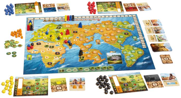 ●内容物:大きなゲームボード1枚、洞窟カード24枚、勝利点カード14枚、食料駒30個、その他のカード18枚、部族マット4枚、斥候駒12個、小屋駒80個、袋タイル24枚、初期採集タイル8枚、発見タイル63枚、動物タイル24枚、発明カード17枚、ルールブック1冊+別表1枚他