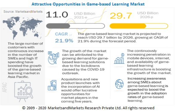 MarketsandMarketsはレポートの公開資料において、 ゲーム学習の市場規模は2021年に110億ドル、2026年までには297億ドルに達し、予測期間に年平均成長率(CAGR)は21.9%で成長するとの予測結果を発表しました。