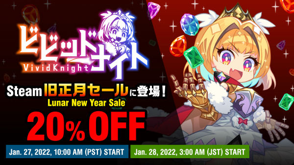 Steamにて開催される“Steam 旧正月セール”に、パーティ構築型ローグライクゲーム『ビビッドナイト』が登場!日本時間の1月28日 (金) 午前3時より20%オフにてお求めいただけます。国内外でご好評いただいている本作を、この機会にお試しください!