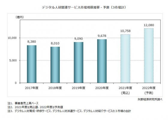 2021年度のデジタル人材関連サービス市場は前年度比11.2%増の1兆758億円を見込む。
