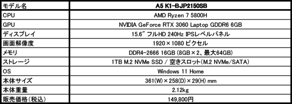 A5 K1-BJP2150SBは、CPUにAMD Zen 3アーキテクチャを採用した、ベースクロック3.2GHz、ブースト時最大4.4GHz動作を実現する8コア/16スレッドのRyzen 7 5800Hプロセッサ、GPUにNVIDIAの第2世代RTXアーキテクチャAmpereを採用した GeForce RTX 3060 Laptop GPUをそれぞれ搭載した15.6型ゲーミングノートPCです。OSには、Microsoftの最新OSであるWindows 11 Homeを採用。シンプルかつ使いやすい新デザインのユーザーインターフェイスにより、一層使い勝手が向上しています。
