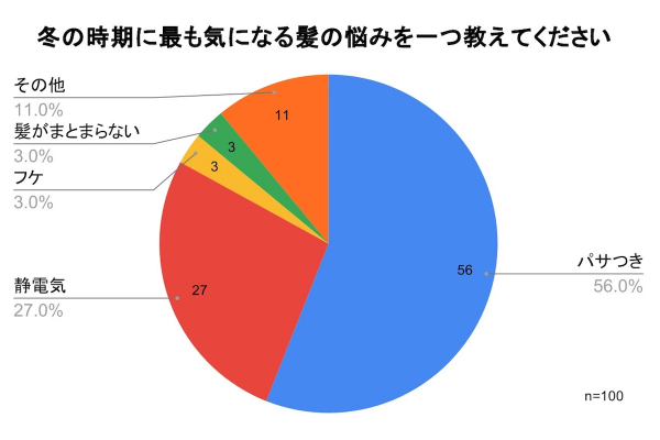 冬の時期に最も気になる髪の悩みのアンケート結果をまとめると、パサつきが56%、静電気は27%と、合計83%の人がパサつきと静電気で悩まされていることがわかりました。