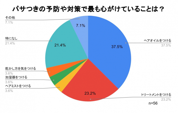 「パサつきの予防や対策で最も心がけていることはなんですか?」の質問では、『ヘアオイルをつける』が最も多い37.5%という結果となり、『トリートメントをつける』が23.2%、『特になし』が21.4%となりました。