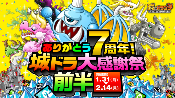 株式会社アソビズム(本社:東京都千代田区、代表取締役:大手智之)は、App Store・Google Playにて好評配信中の『城とドラゴン』で、「ありがとう7周年!城ドラ大感謝祭(前半)」を2022年1月31日(月)より開催いたします。