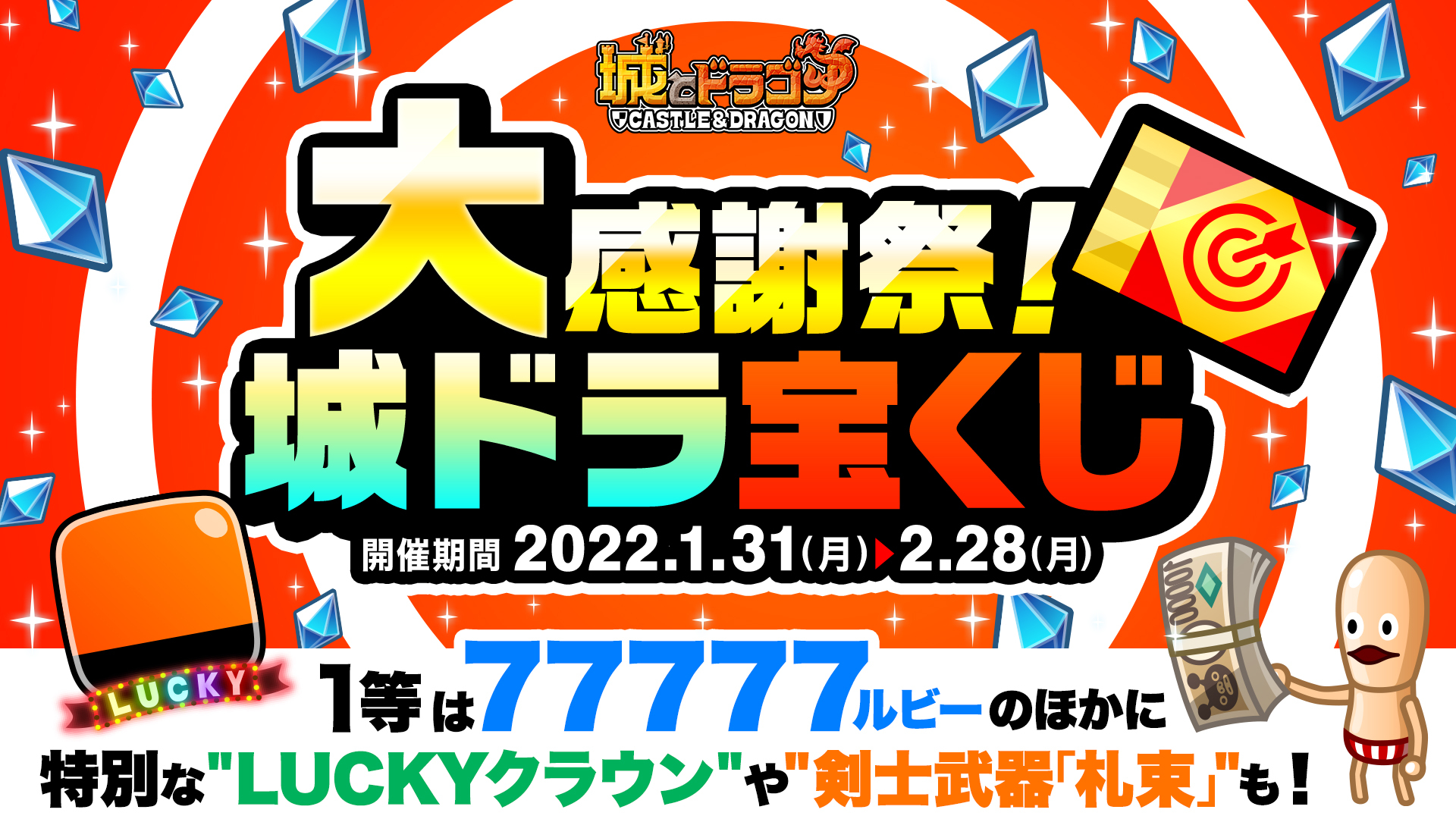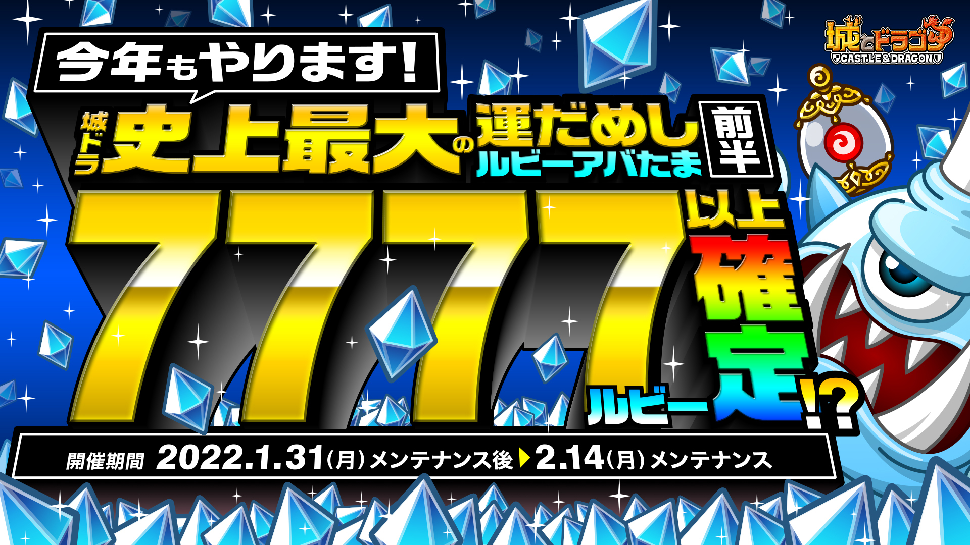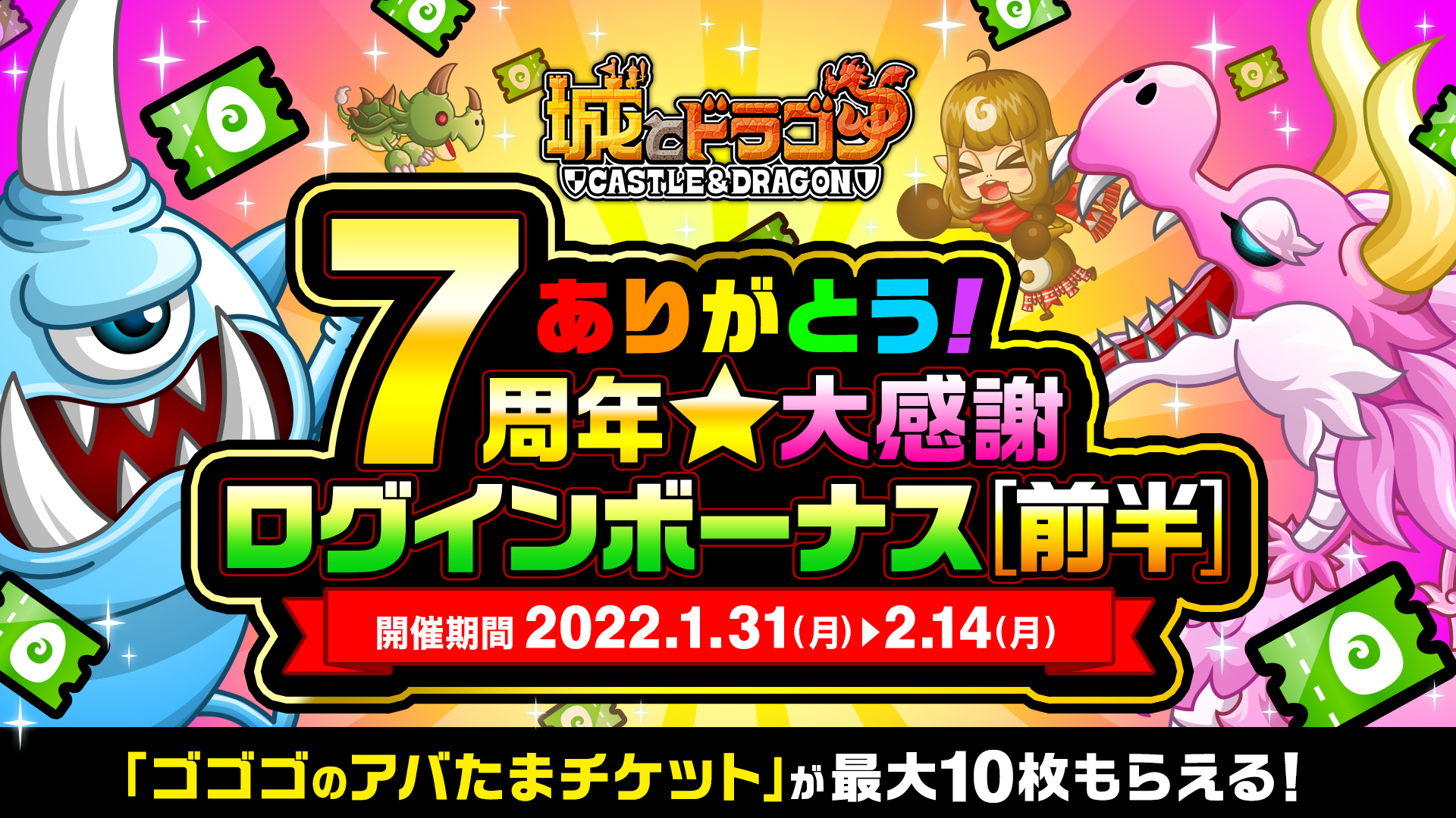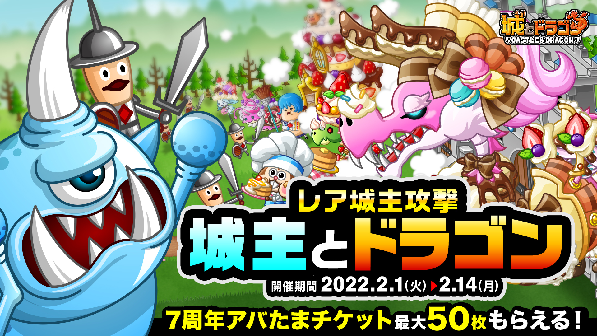 『城とドラゴン』は2022年2月5日(土)でサービス開始から7周年を迎えます。日頃よりプレイいただいているプレイヤーの皆さまには、心より御礼申し上げます。つきましてはこれを記念したキャンペーン「ありがとう7周年!城ドラ大感謝祭(前半)」を1月31日(月)より開催いたします。特別なログインボーナスやミッションはもちろんのこと、必ず“7777ルビー”以上が当たる「7777ルビー以上確定?!ルビーアバたま」や、最高“77777ルビー”と特別なフレームが当たる「大感謝祭!城ドラ宝くじ」など、今年も特大イベントが目白押し!7周年もぜひ『城とドラゴン』でお楽しみください!