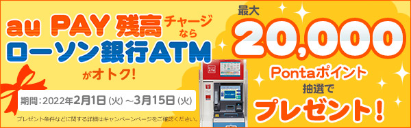 期間中、ローソン銀行ATMからau PAY 残高に累計10,000円分以上チャージしたお客さまを対象に、抽選で20,000Pontaポイントを500名さま、500Pontaポイントを20,000名さまにプレゼントします。