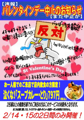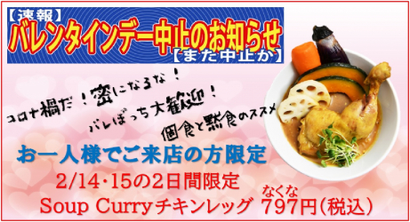 有限会社マジカルエッグ(本社:東京都足立区)が東京・墨田区で運営している店舗「お江戸スープカレーちゃはや庵」は、2月14日(月)・15日(火)の2日間にかぎり、“おひとりさま”で来店いただいたお客さまに通常1,100円(税込)の店舗自慢メニュー「スープカレーチキンレッグ」を797円(なくな)(税込)で提供する「バレンタイン中止!バレぼっちフェア」を実施します。クリスマスにつづいて、バレンタインデーも“ぼっち”のシェフが考案した自虐フェアで、同じ“ぼっち”のお客さまを応援するとともに、再拡大している新型コロナウイルスの感染対策として“個食”をおすすめする取り組みです。