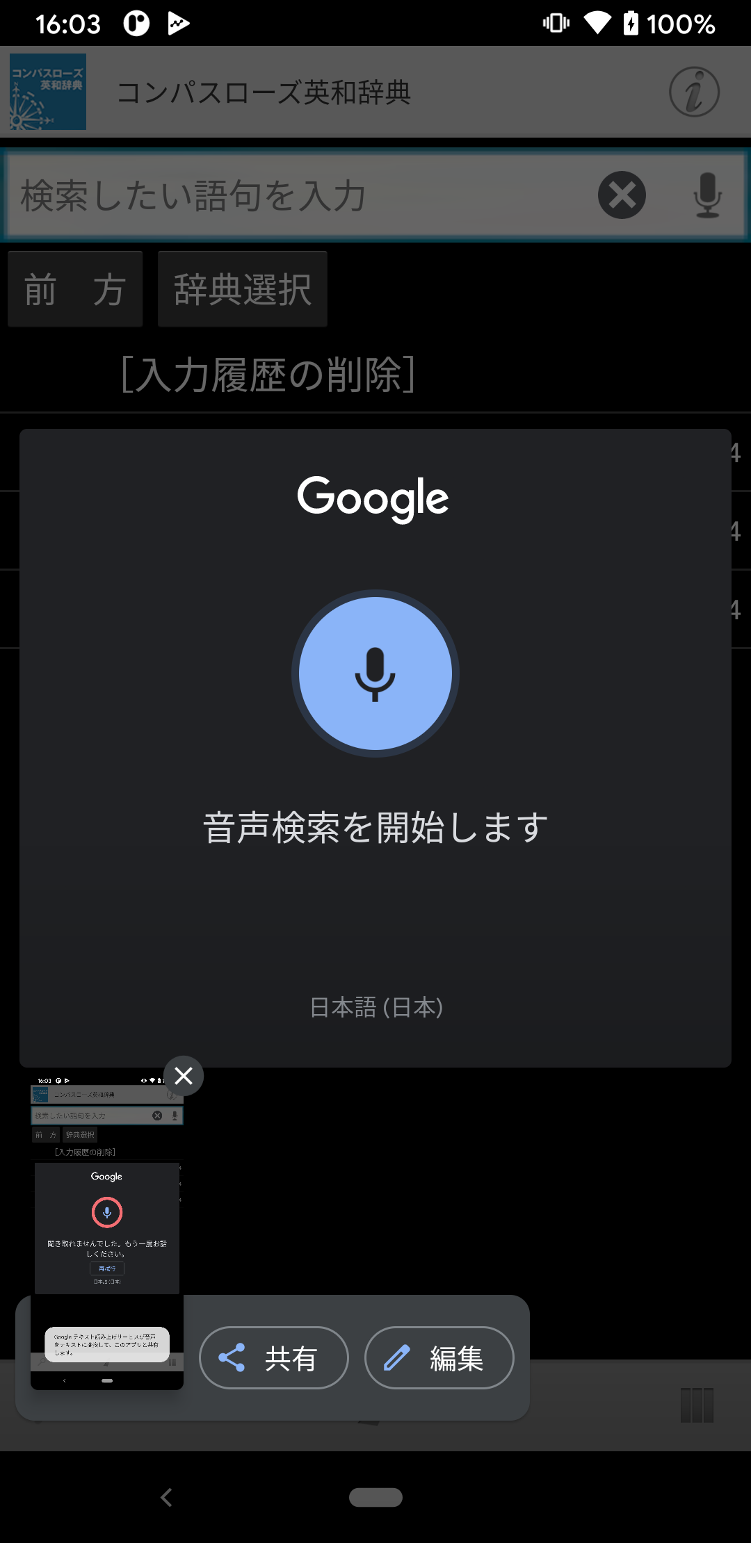 ・「共有」とは逆に、辞典項目のテキストを使用して、ウェブ検索が可能です。もちろん、辞典アプリの検索もできます。