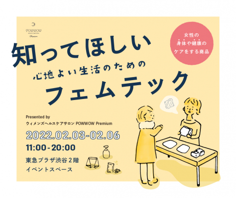 株式会社SMILE CREATE GROUP(本社:東京都千代田区、代表取締役社長:伊藤賢治)が2022年2月3日(木)~2月6日(日)まで東急プラザ渋谷二階イベントスペースにて期間限定出店いたします。「女性のお悩みに寄り添う」の理念を持って、昨今国内外で注目を集めるフェムテック商品を取り扱っています。エクオールサプリメントや生理用ショーツの他、骨盤底筋トレトレーニンググッズまで幅広くご用意いたします。