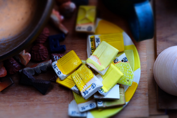 テストピースに色々な黄色の色がついているのは、新色の黄色の釉薬のテストの様子。何十・何百と釉薬の調合をためして理想のものを作っていきます。
