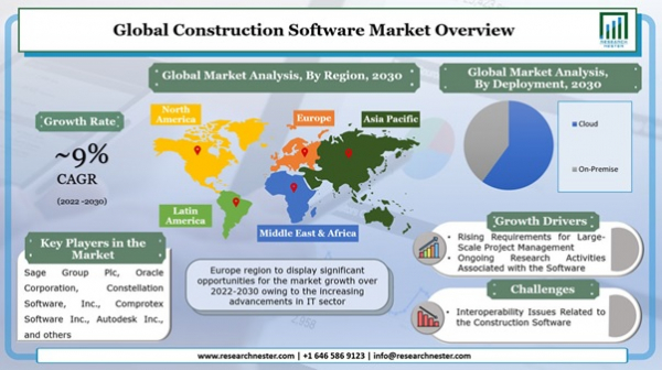 世界の建設ソフトウェア市場の成長は、大規模なプロジェクト管理に対する要件の高まり、およびソフトウェアの改良バージョンを設計するための継続的な研究開発活動に起因する可能性があります。さらに、建設業界におけるリーン経営の応用分野の拡大、および企業の生産性を高めるための投資の拡大も、今後数年間で市場に大きな成長をもたらすと予想されます。