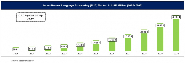 日本の自然言語処理(NLP)市場は、(2021ー2030年)の予測期間中に25.5%のCAGRで成長することにより、2030年末までに4739.4 百万米ドルの収益を獲得すると推定されています。