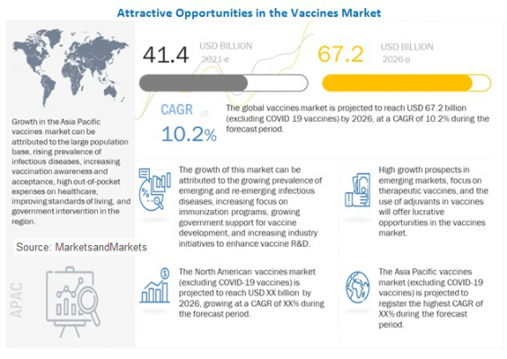 MarketsandMarketsはレポートの公開資料において、世界の新型コロナワクチンを含むワクチン市場は2021年に1,394億ドル、2026年には1,492億ドルに達するとの予測結果を発表しています。また新型コロナワクチンを除いた世界市場は2021年に414億ドル、2026年までには672億ドルに達し、2021年から2026年にCAGR10.2%で成長すると予測しています。