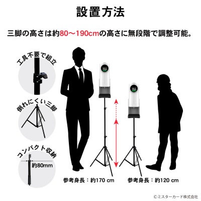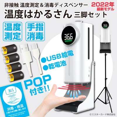 ミスターカード株式会社(本社:埼玉県川口市)は、お客様の声をカタチにした2022年最新モデルの非接触式で温度測定と消毒を1度にできる効率の良い消毒ディスペンサーの三脚「温度はかるさん三脚セット」を2022年2月15日(火)から発売いたします。手を入れて約0.5秒で温度と消毒が同時にできるので行列になりません。電源は常時設置のUSB給電や長期間使える電池に対応し、単二形乾電池×4本で電源コンセントの無い屋内スペースでも長期間利用できます。大容量1200mlの消毒液タンク、噴射量20段階調整、アラームや音声でお知らせ、音量、多カ国語対応などの機能搭載。クリーニング機能付きで約10秒ノズルを洗浄します。今なら、POP、漏斗、動物おめんのオリジナルグッズ3点がもらえます。オフィスやお店、学校、施設などの安全につながる感染予防対策グッズをご提案いたします。