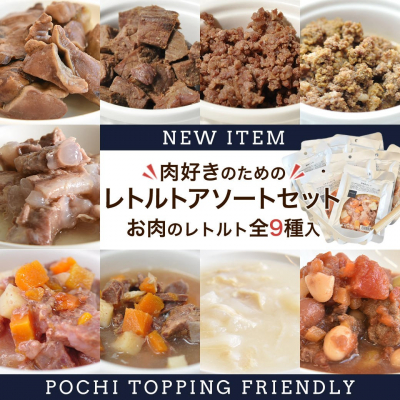 プレミアムドッグフード専門店・通販「ポチの幸せ(POCHI)」(運営:マーケティングパートナー株式会社、本社所在地:東京都新宿区、代表取締役社長:権田真司、Tel:03-6772-8194)は、肉好きな犬たちのために、鶏肉・鹿肉・馬肉・豚肉などバラエティ豊かな9種類のレトルトをセレクトしたアソートセットを1月28日より新発売しました。価格は、9種類セットで3,900円(税込み)です。