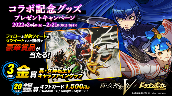期間中、『ドラゴンポーカー』公式Twitterアカウント(@DragonPoker_aso)が投稿した、キャンペーン対象ツイートをリツイートしていただいた方の中から抽選で、『真・女神転生V』のキャラファイングラフやギフトカードをプレゼント!ふるってご参加ください。