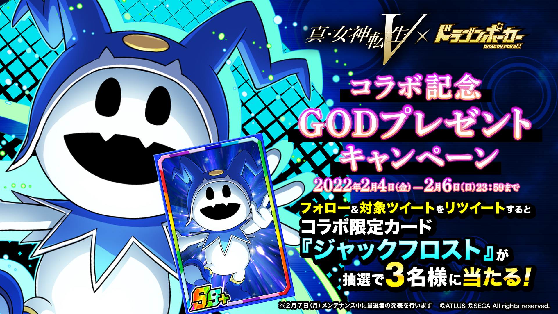 2月4日(金)より、大人気ゲーム『真・女神転生V』とのコラボを記念してプレゼントキャンペーンを実施いたします。『ドラゴンポーカー』公式Twitterアカウントをフォローし、対象ツイートをRTしていただいた方の中から抽選で、『真・女神転生V』のグッズやギフトカード、コラボ限定カード『ジャックフロスト(真V)』などをプレゼント!