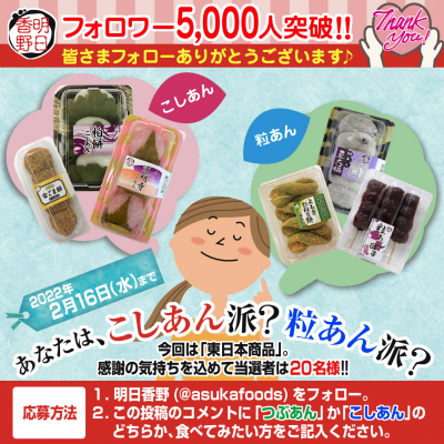 キャンペーンに参加していただいた方の中から合計20名様に、東日本のこしあん、または粒あんの販売商品を、プレゼントいたします。