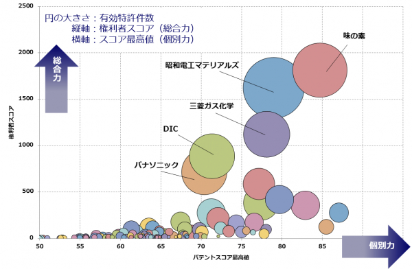 1位 味の素はアミノ酸に関するノウハウを応用したエポキシ樹脂に関する技術を基板用絶縁材料に応用しており、事業としてはグループ会社の味の素ファインテクノが行っているものの、特許の名義は味の素となっています。同社の注目度の高い特許には、「可とう性に優れ、絶縁層表面の粗度が低くても、高いピール強度を有する導体層が形成可能である樹脂組成物」や「湿式粗化工程において絶縁層表面の粗度が小さく、十分なピール強度を有するめっき導体層を形成することができ、誘電特性、熱膨張率にも優れた樹脂組成物」などが挙げられます。