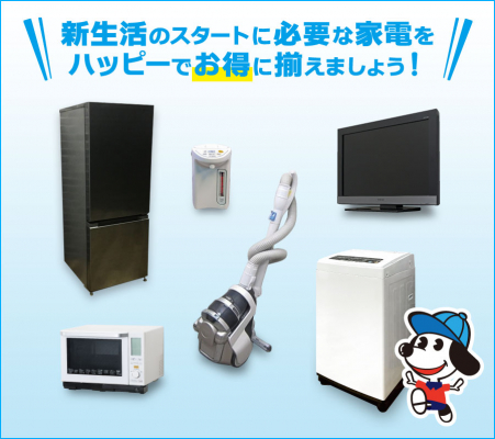 今回の“春の新生活応援キャンペーン”は、その場でご入会いただけるポイント会員サービス「Happy会員」に登録された会員様が対象。冷蔵庫や洗濯機、テレビなど新生活の必需品をはじめ、店内すべての商品お買い上げに対し、通常進呈する購入額1%のポイントの5倍(5%)をプレゼントいたします。また当社商品は、独自基準による徹底したクリーニングと、専門スタッフによる厳しい商品検査および動作確認を行うことで、安心・快適にご使用いただけるものに仕上げた、上質のリユース品。そのうえ1年保証も付いて、さらに安心です。