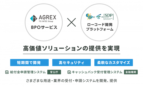 1,700社超の企業をお客様に持つアグレックスは、TISインテックグループの中核企業として、幅広い業界に対して、AIやRPAなどの最新技術をはじめとするIT技術を活用したBPOサービスを提供しています。なかでも、官公庁や金融系のお客様からは、近年急速に進むデジタル化やキャッシュレス事業に対応するため、「給付金申請管理システム」や「キャッシュバック受付管理システム」など、急を要する案件の相談を受ける機会が増えていました。加えて、重要な個人情報をシステムで管理するため、高いレベルのセキュリティ対策も求められました。以前は、お客様の要望に合わせてフルスクラッチで開発していたため、開発リソース不足で依頼を断らざるを得ないケースもあり、大きな機会損失になっていました。