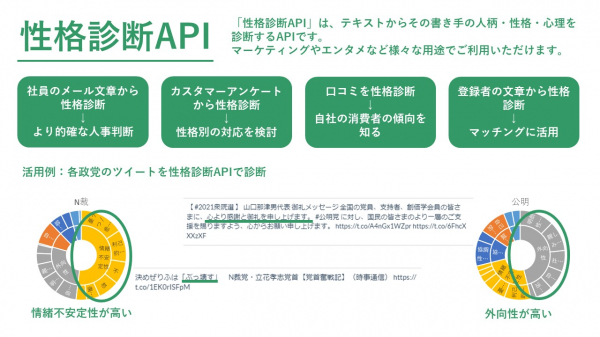 特に、毎週、毎月など、一定期間中の投稿件数の増減を計測したり、ネガポジ度の時系列変化を計測することもできるツイートは重要です。特定ユーザーのツイートを100件以上集積すれば、性格診断APIにより、発言者の性格類型を推定。これにより、その発言者に好適なアプローチ方法、セールストークを選択したりAIで自動生成することも可能になりつつあります。