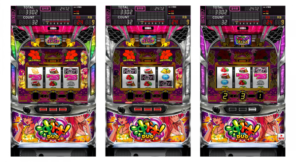 沖ドキ!シリーズでお馴染みのゲーム性“32Gの天国ループ・BBの1G連・90%ループの超ドキドキモード”に加えて、自力で天国モードが狙える“ドキハナチャンス”や、多彩な液晶のモード推測などの新要素もスマートフォンアプリで忠実に再現しました。カナちゃん&ハナちゃんが歌う新規楽曲は標準搭載です。