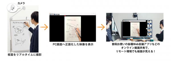 通常のホワイトボードにカメラを搭載。ボードマーカーで自由にすばやく書き込め、普段お使いの各種Web会議アプリで共有すればリアルタイムに参加者全員に同じ板面を表示することができます。ボード内蔵の専用ソフトウエアが板面を見やすく補正、また板書内容を時系列に並べたり、拡大したり、画像として保存もできるので、Web会議の情報共有を効率化します。