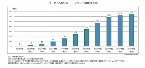 ローカル5Gは、2025年度以降、製造や工場現場を中心に建設、医療、スマートシティといった分野が牽引して実装が本格化し、2030年度のローカル5Gソリューション市場(事業者売上高ベース)を650億円になると予測する。